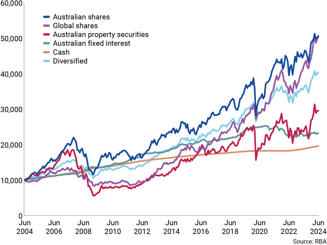 It’s understandable at times like these that some members think about changing how their money is invested. As this chart shows, the long-term trend across major investment types is positive, with shares experiencing more volatility but generating higher returns than more conservative options such as cash.